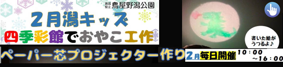 2026年02月07日野鳥観察会 2026年02月01日2月潟キッズ「ペーパー芯プロジェクター 作り」 2026年01月05日冬芽葉痕まつり 2025年4月1日~とり撮りまつり開催中♪ 2020年04月19日~公園のYouTubeチャンネル開設しています! 女池地区のイベント 鐘木地区のイベント