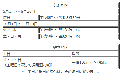 女池地区と鐘木地区で夜間の閉鎖時間、曜日が変わります。