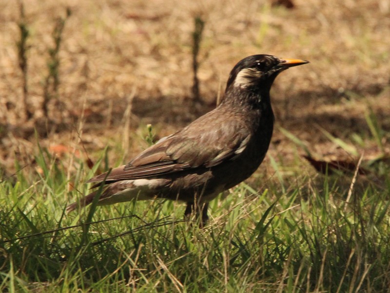水辺の広場では、スズメやムクドリなどが
