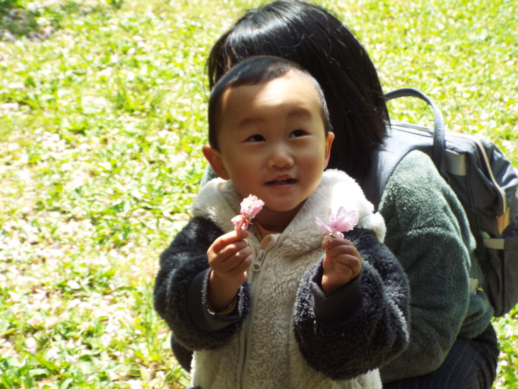 まず、緑側帯の桜の木の根元で皆でなにかを探します。