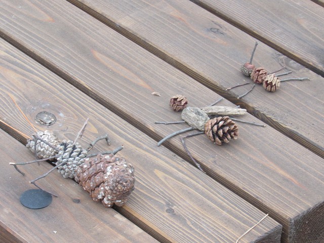 プロジェクトワイルドでは、踏めるものを指定して進むゲームや落ちている枝や松ぼっくりを使ってアリを作るなどをしました。人によって使う材料や作り方が違いとても楽しかったです。