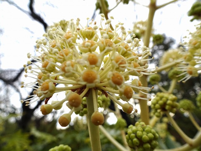 ヤツデの花は鳥屋野の路沿いで、