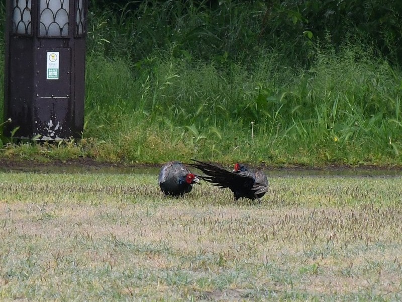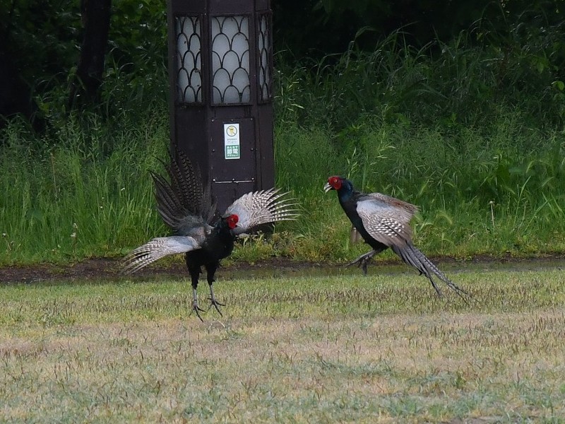尾羽を広げ、まさに威嚇ポーズ。結果は引き分けでした![]()