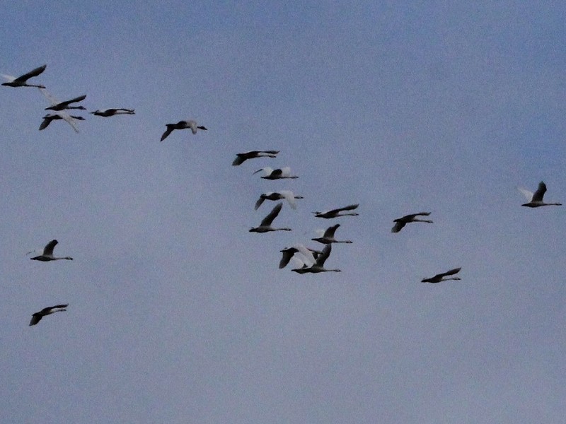 朝鳥屋野潟上空をハクチョウの群れが