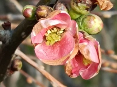 ボケの花も咲きはじめました。控えめな感じの花がとてもきれいです。