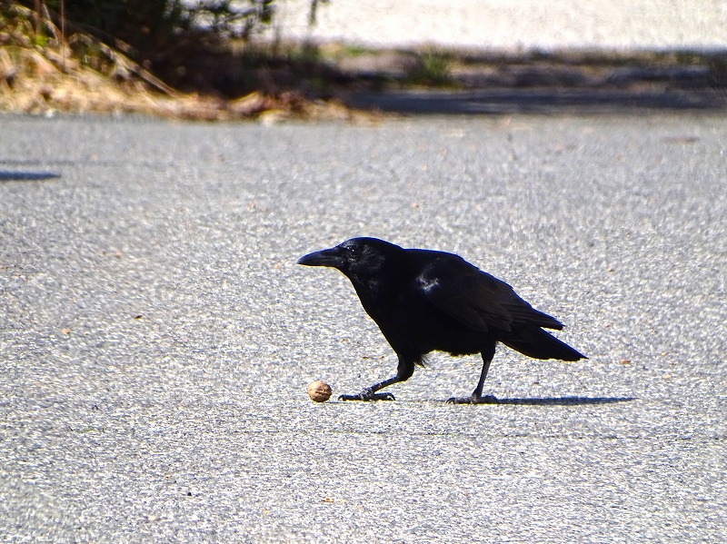 ハシボソカラス:クルミを落下させています。車にあてないでくれよ~