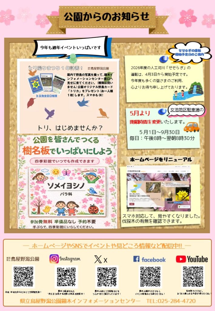 お知らせ かめ吉新聞No.78を発行しました。 2026年3月27日 いつも鳥屋野潟公園をご利用いただき 誠にありがとうございます。 かめ吉新聞No.78を発行しました。 これから見頃となる植物や桜まつりイベントの案内です。 ぜひ、ご覧ください。 下記からダウンロードしてご利用ください。 かめ吉新聞No.78 Previous 【女池地区】桜は膨らみ下ではエサ探し奮闘中 Next 4月潟キッズ「お花シール 作り」4/1-30 最近の投稿 4月潟キッズ「お花シール 作り」4/1-30 かめ吉新聞No.78を発行しました。 【女池地区】桜は膨らみ下ではエサ探し奮闘中
