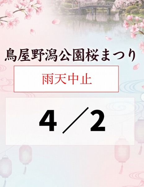 お知らせ 4/2の桜まつり雨天中止 2026年4月2日 いつも鳥屋野潟公園をご利用いただき 誠にありがとうございます。 本日(4/2)の「桜まつり」は雨天中止と させていただきます。 Previous ❀速報❀開花宣言! 最近の投稿 4/2の桜まつり雨天中止 ❀速報❀開花宣言! 鳥屋野潟公園 桜まつり 4/1-4/12