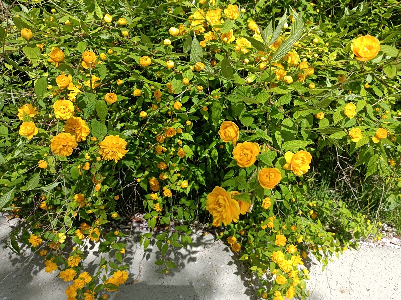 新堀橋をわたって、ユスリカの森を超えたメイン園路では、八重のヤマブキが見頃になっています。