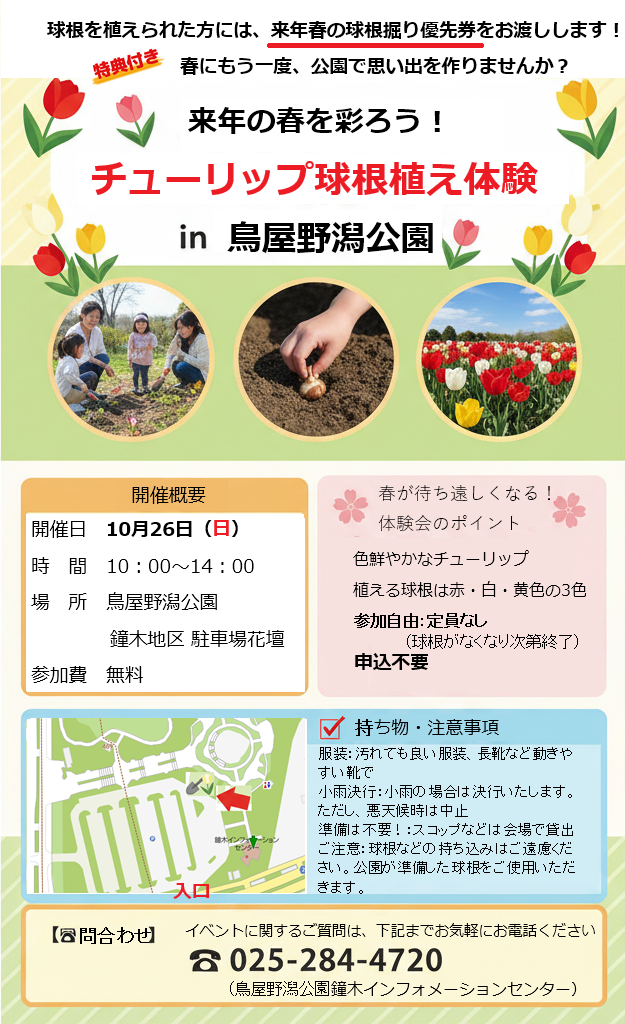 備考 | 服装:汚れても良い服装、長靴など動きやすい靴でお越しください。 小雨決行:小雨の場合は決行いたします。ただし、悪天候時は中止となりますのでご了承ください。 準備は不要:スコップなどは会場で貸し出しいたします。 ご注意:球根などの持ち込みはご遠慮ください。公園が準備した球根をご使用いただきます。 |