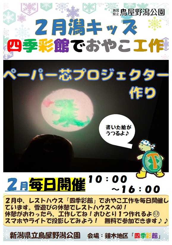 2月中、レストハウス「四季彩館」でおやこ工作を毎日開催しています。雪遊びの休憩でレストハウスへGO!