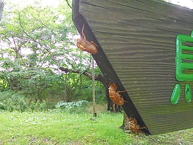 鳥屋野潟公園 女池地区を巡回していたところ・・・ セミの抜け殻が同じ場所に 等間隔に仲良く並んでいました どんな順番で羽化したのかが 気になるところです この看板には写真の3匹(3殻?)の他にも いくつか抜け殻がくっついていました。 この女池地区「鳥屋野の路」にある看板は セミ達に人気のスポットのようです 担当:R