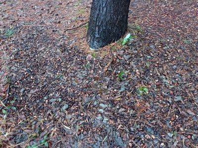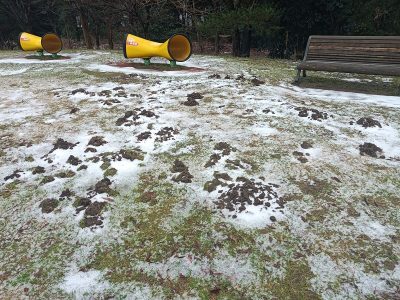 トリムの森の丘の上には、モグラの掘り出した土のあと。
