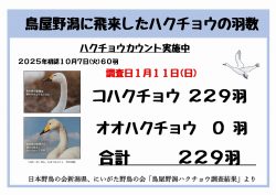 コハクチョウ229羽 オオハクチョウ0羽 計229羽確認できました。 鳥屋野潟にも少しハクチョウが戻って来ました。 2月、3月に入ると北上し始め観察しずらくなります。 ハクチョウが観察できる今鳥屋野潟公園にお越しください。 担当:IS