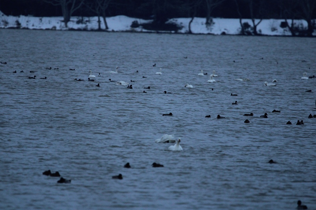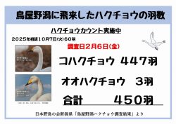 コハクチョウ447羽 オオハクチョウ3羽 計450羽確認できました。 上沼地区の入り江にコハク25羽 桜木町地区入り江に コハク145羽、オオハク3羽 清五郎潟にコハク277羽となりました。 オオハクチョウの姿を確認しました。(2つ目の画像) クチバシの黄色の模様が大きいのが特徴です。 今季は都合により、適宜情報を公開させていただきたいております。ご理解ご協力をお願いいたします。 担当:IS
