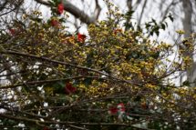 2020年03月04日 小さな春があちらこちらに… こんにちは! 小さな春があちらこちらに… 女池地区でも、 水辺の広場、展望台裏側で サンシュユ(山茱萸、春黄金花)が 咲いています。 赤いツバキとの対比がキレイです。 「しらべの小径」では、 ヒイラギ…